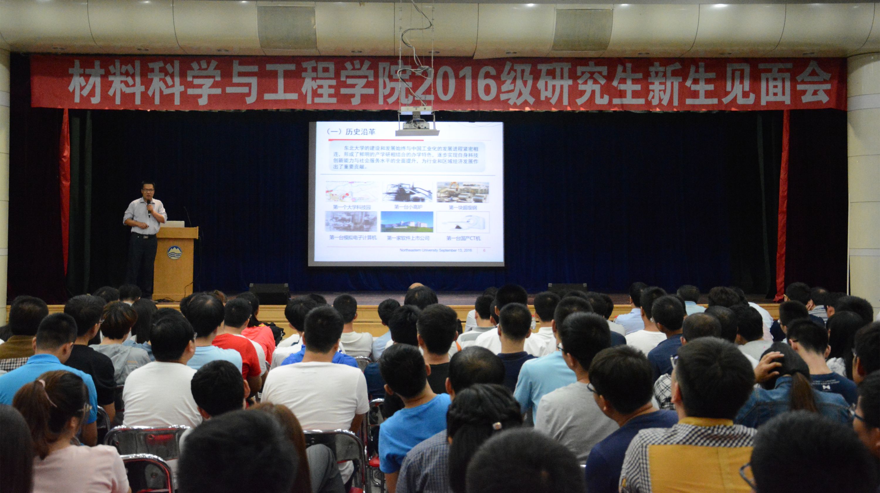 2016年9月13日,材料科学与工程学院2016级研究生新生见面会在大学生活动中心多功能厅成功举行。材料科学与工程学院院长秦高梧教授、党委书记张玉宝老师、副院长赵志浩副教授、副院长祁阳教授、党委副书记兼副院长贺翔副教授,材料系主任茹红强教授,副主任陈岁元教授,副主任李晓东教授,副主任申勇峰教授,刘沿东教授,材料物理与化学系主任李小武教授,副主任孙本哲副教授,秦皇岛分校资材学院院长罗绍华教授,副院长郝爱民教授以及研究生教学科研办副主任王大海老师,李楠老师,团委书记孙巍巍老师和学院500余名研究生新生一同参加了本次大会。大会由材料学院研究生辅导员王鹤棋主持。