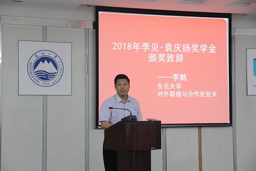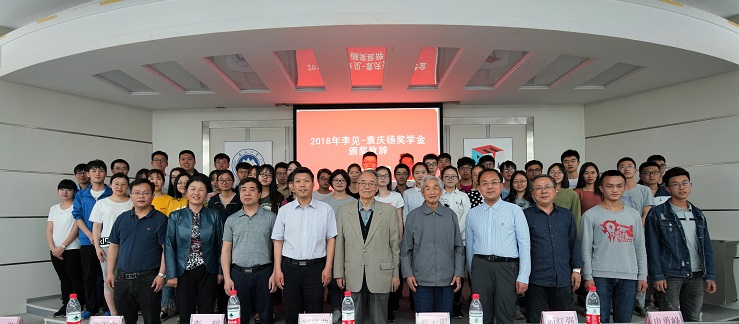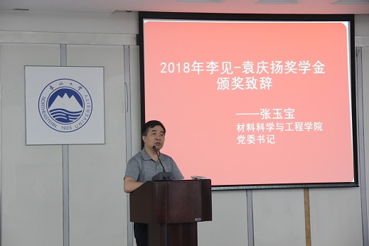 接下来,材料学院党委书记张玉宝进行颁奖致辞,他从三个方面阐述了李见-袁庆扬奖学金带给他的感动:第一,纪念李见,也就是纪念培养自己的老师。老师给予的关爱可以促进学生的成长,可以扩展其未来成长的空间。同时,学生对于老师,对于学校的感情,是无价的,是人生中的最美丽财富;第二,同事之间的友情更是当今社会难能可贵的收获,是真正深厚的真挚的永生难忘的感情;第三,人要有感恩的意识。袁庆扬学长并不是多富有的人,但是他重情重义,他有一颗炽热的学子之心,才能做到向学校、老师、同事回报。