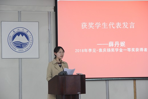 在了解奖学金设立情况后,蒋敏副院长宣读了2018年李见-袁庆扬奖学金获奖名单,李见-袁庆扬奖学金设立人之一的郝士明老师、材料科学与工程学院副院长贺翔、材料科学与工程系副主任申勇峰老师和李晓东老师为获奖学生颁奖。一等奖学金获得者——功能1501班薛丹妮同学,代表获奖学生进行发言。她向与会领导、嘉宾、老师和同学们分享了学习材料科学基础课程收获的心得与体会,对李见-袁庆扬奖学金坚持的科学精神致以诚挚敬意,并对材料学院对学生们的辛勤培育表示衷心的感谢。