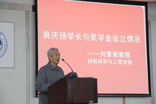 刘景荣老先生向与会师生讲述了袁庆扬学长奖学金的设立经过,他说袁庆扬老先生的老师是原材料专业李见教授,为了回报李见老师的教导以及多年来在雷竞技官方主页学习和工作中获得的知识,同时他对雷竞技官方主页的材料学子也怀有殷切的期望,因此设立了李见-袁庆扬奖学金。刘老先生通过讲述自己与袁庆扬学长接触共事的过程,向同学与老师们展示了一个朴素、热情的袁庆扬学长形象。他强调李见-袁庆扬奖学金的来源并不富裕,作为工程师的袁庆扬教授从自身薪水中出资设立的这个奖学金,体现出了袁老先生对材料后辈的大力支持和深情关怀。