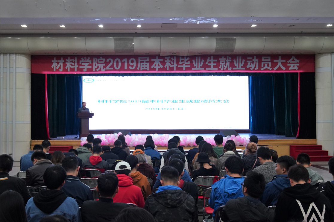 2018年10月17日,材料科学与工程学院2019届本科毕业生就业动员大会在大学生活动中心多功能厅举行。材料学院党委副书记兼副院长贺翔、学生工作办公室主任杨明凤以及材料学院大四本科毕业生等300余人参与大会。