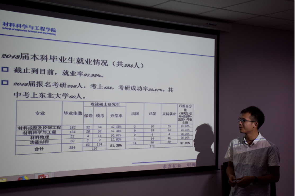 分享交流会的第一个环节是材料学院就业情况分析,主持人周吉鑫就收集到的调查资料有针对性地分析了学院同学的求职情况,提出了面对就业压力,要积极主动、知己知彼、自信乐观的建议。