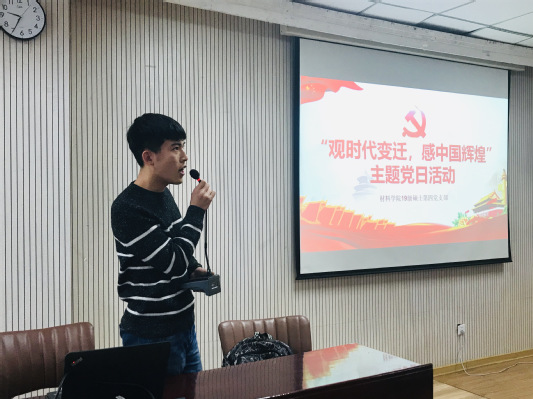 为更好地铭记十八大以来中国取得的辉煌成就,感受祖国近年来日益强大,11月24日上午,材料学院硕士1904党支部在大学生活动中心200室举办主题党日活动,观看纪录片《厉害了我的国》,支部全体党员、积极分子参加本次活动。