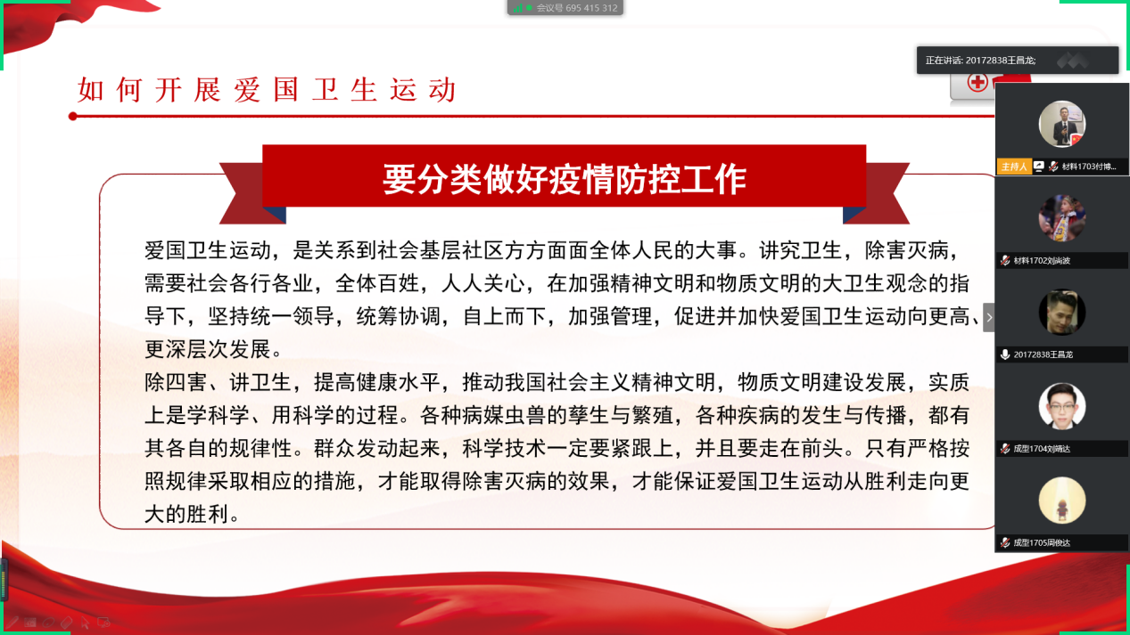 为了继承和发扬爱国卫生运动优良传统,强化大学生的爱国意识、预防优先思维和健康素养,4月19日下午,材料学院本科生党支部开展以“防疫有我,爱卫同行”为主题的线上党日活动,2017级全体预备党员参加此次活动。
