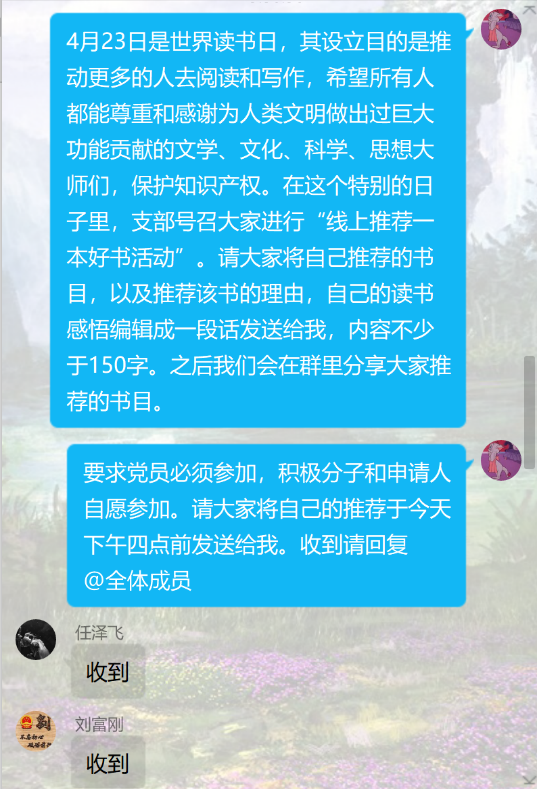 同学们积极响应支部号召,将推荐的书目、推荐理由以及个人读书感悟在线分享给大家,书籍内容涵盖了政治、文学、艺术、历史等多个方面,拓展了同学们的眼界。党支部书记闫渤对同学们推荐的书籍进行了梳理,并建议大家充分利用好居家抗疫时期,在科研学习之余,能够静下心来阅读一本好书,养成爱读书的好习惯。活动结束后,同学们均表示受益匪浅,既拓宽了在读书方面的视野,也激励自己不断提高自身综合素质。