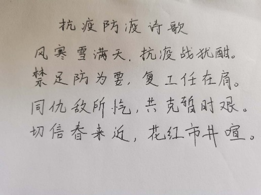 活动开始,支部书记徐明武说明本次活动的具体流程,活动主题分为两个小主题:一是青春向党,勇现青年人的责任与担当;二是弘扬奉献精神,讴歌防疫战役中的大无畏精神,同学们自行选择两个主题挑选诗歌进行朗诵,最终全员投票决定本次活动比赛的第一名。随后,同学们踊跃进行朗诵。同学们纷纷感念在防疫战役中为国无私奉献的医护工作者大无畏精神,在朗诵的字里行间深表对医护人员奉献精神的赞扬。最后,张家文以其刚劲有力字迹和饱满的朗诵热情获得了本次朗诵比赛的冠军。