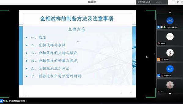 赵卓围绕参赛要求、竞赛时间安排、奖励办法等方面介绍了校赛层面的金相技能大赛,并开展了竞赛指导培训,详细介绍了金相试样的制备流程,操作方法及注意事项。