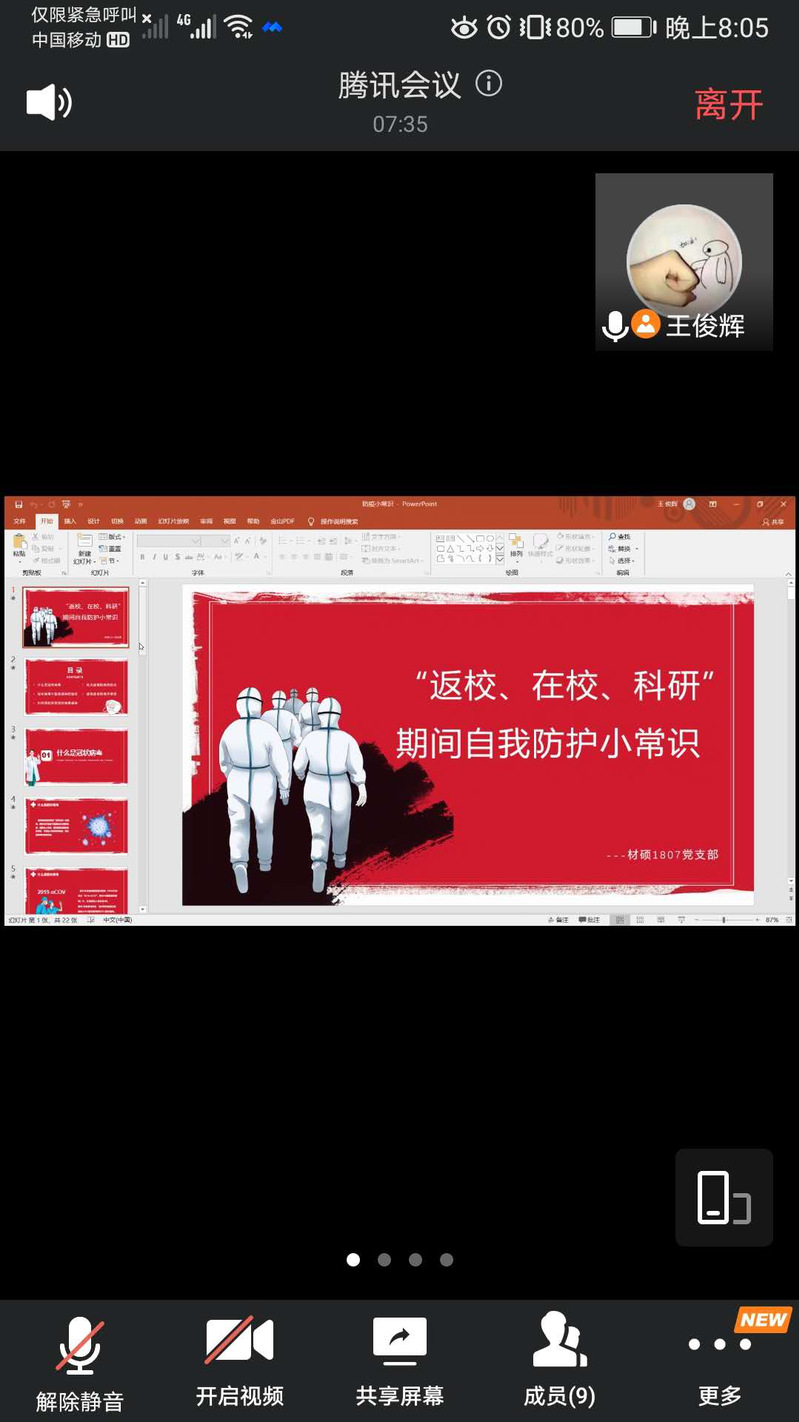 为确保疫情期间支部工作能够正常进行,增强同学们在返校、在校、科研期间的防疫意识,7月15日晚,材料学院硕士1807党支部组织“战疫期间不停研,提高意识是关键”线上党日活动,支部全体成员参加此次活动。