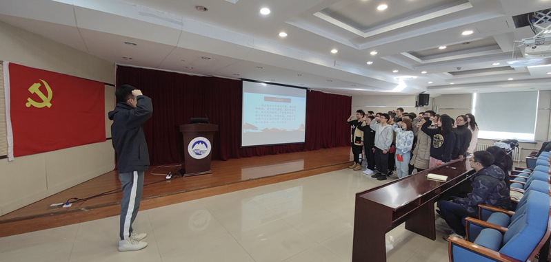 宣布结束后,组织委员李刚带领全体预备党员进行庄严宣誓,同时也向支部成员表达自己的想法,他希望各位今后继续严格要求自己,只争朝夕,不负韶华。宣传委员姜媛勉励大家注意形象,不忘身份,发挥模范带头作用,不断学习,提高觉悟,处处以党员先锋模范为榜样要求自己。最后支部书记杨壹程做大会总结发言,他表示入党并不意味放松,希望各位在今后积极发挥模范带头作用,坚定理想信念,肩负起时代赋予的使命,做知行合一的示范者。