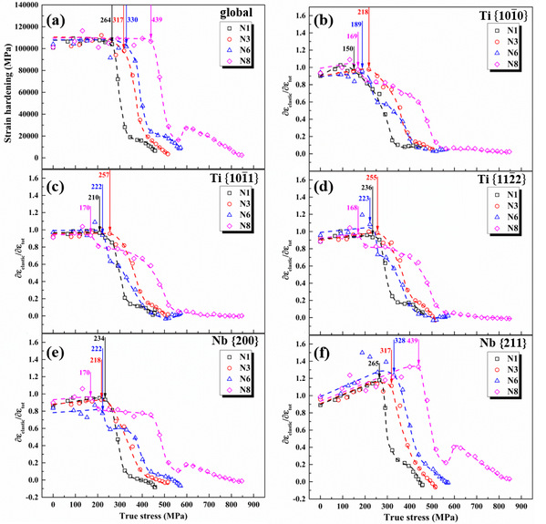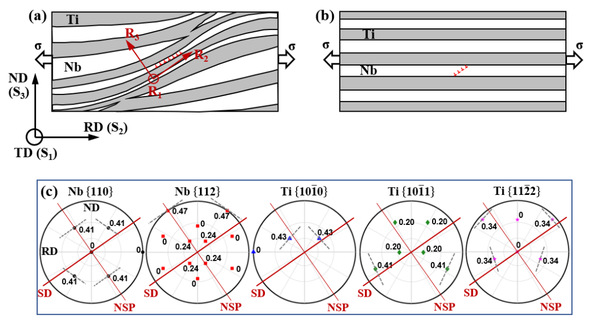 基于此,贾楠教授团队通过与瑞典林雪平大学、德国电子同步加速器研究所等单位合作,借助同步辐射原位高能X射线衍射技术对经累积叠轧(ARB)制备的Ti/Nb多层复合材料的微观应力与宏观力学性能的关联性进行了研究。通过分别对包含有平直界面和剪切带开动导致的弯曲界面的复合体在拉伸载荷下的微观结构演化(图1)、微观应变分布与演化(图2)的精细表征可知,随着ARB循环次数增加,复合材料的快速强化主要来源于Nb层中位错、晶界和异质界面的强化作用,{211}取向晶粒对材料整体的应变硬化起主要作用。同时,较软的Ti晶粒使得块体材料的应变硬化范围扩大,从而延缓了颈缩发生(图3、4)。此外,对全应力状态的计算揭示了在形变剪切带预先广泛存在于片层状结构的情形下,相邻金属之间显著的载荷传递与再分配导致各组元金属均承受三轴应力,从而促使位错沿着剪切方向滑移(图5)。这促进了各金属内部位错的增殖和运动,有利于在提升强度的同时使复合体维持良好的均匀塑性变形的能力。