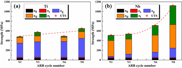 图3 经不同道次叠轧复合体中各组元金属流变应力的来源。σ0: 晶格摩擦力, σs: 固溶强化, σg: 晶界强化, σd: 位错强化, σi: 异质界面强化, UTS: 抗拉强度