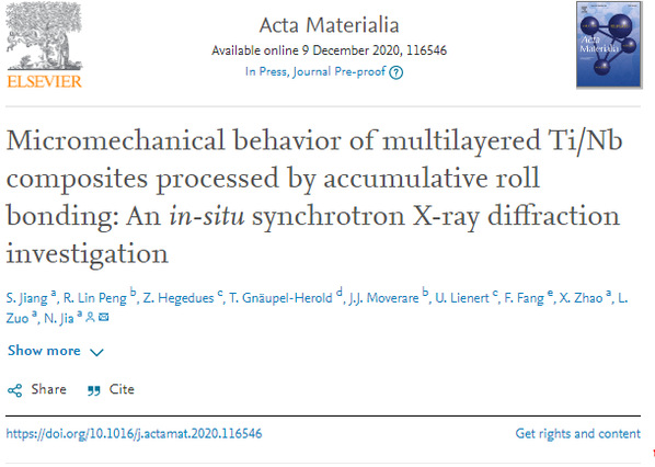 近年来,雷竞技官方主页材料科学与工程学院贾楠教授课题组在金属层状复合材料的剪切带变形机制和形变微取向演化方面开展了系统的实验表征与数值模拟研究,主要成果发表在Acta Materialia (2013,61:4591-4606; 2014,76:238-251; 2016,111: 116-128)和Journal of Materials Science & Technology (2019, 35: 1165)等SCI期刊上。最近,该课题组在“累积叠轧制备亚微米尺度金属层状复合体的形变微结构演化和受剪切带调控的微观力学行为”方面又取得了新的研究进展,为借助微结构和织构调控来改善金属层状复合材料的力学性能以及对双相/复合材料共变形的研究提供了新的思路。相关结果以题为“Micromechanical behavior of multilayered Ti/Nb composites processed by accumulative roll bonding: An in-situ synchrotron X-ray diffraction investigation”发表在Acta Materialia上。