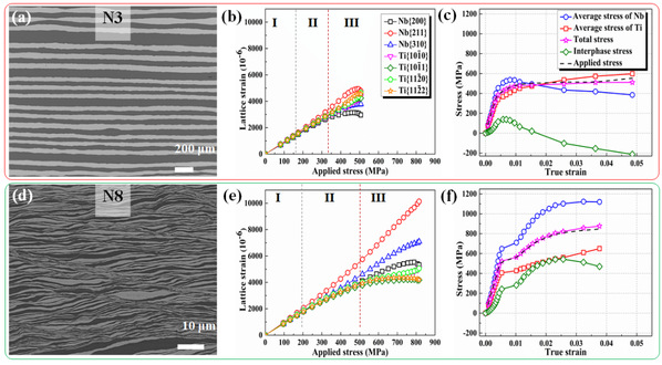 图2 经3道次和8道次叠轧获得的Ti/Nb复合体的层状形貌,在随后拉伸变形中的晶格应变、组元金属的平均应力和组元间交互作用力的演化