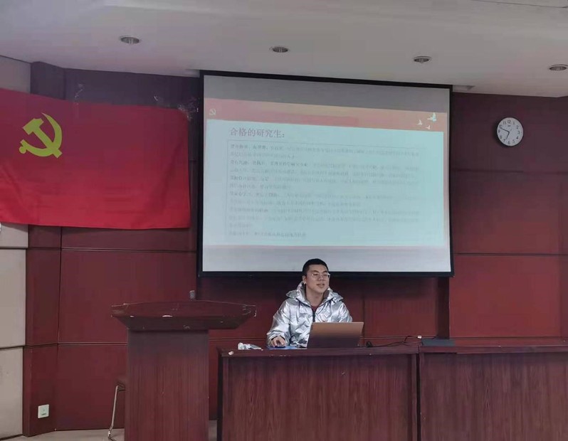 党课之初,支部书记王拥博围绕“忆入党初心,做优秀党员”的主题,从做一名有抱负、有理想、有追求的研究生到做一名讲奉献、有作为、敢担当的“四讲四有”研究生党员逐层递进地向大家进行了讲解。本次课程以历代共产党人勇于担当为引,回忆入党初心,让大家在故事和回忆中感受到党领导人民的正确性并明确党员的责任担当意识。课后,党员代表肖尊涛表示,通过此次党课,对比一名优秀的共产党员,明确了自身应学习之处,在今后的工作中会不断提升自己,为祖国的建设添砖加瓦。
