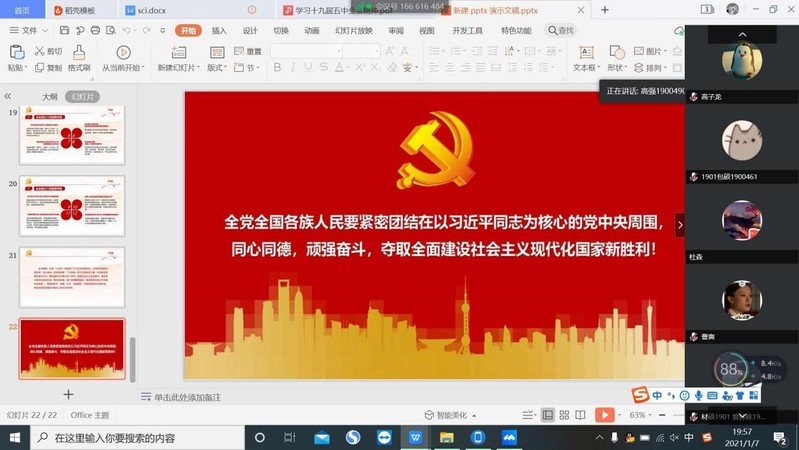 为深入学习贯彻党的十九届五中全会精神,提高支部成员的党性修养,1月9日,材料学院硕士1901党支部线上开展了“绘就新蓝图,开启新征程”主题党日活动,全体党员及积极分子参与此次活动。