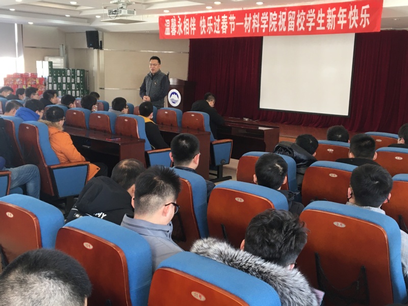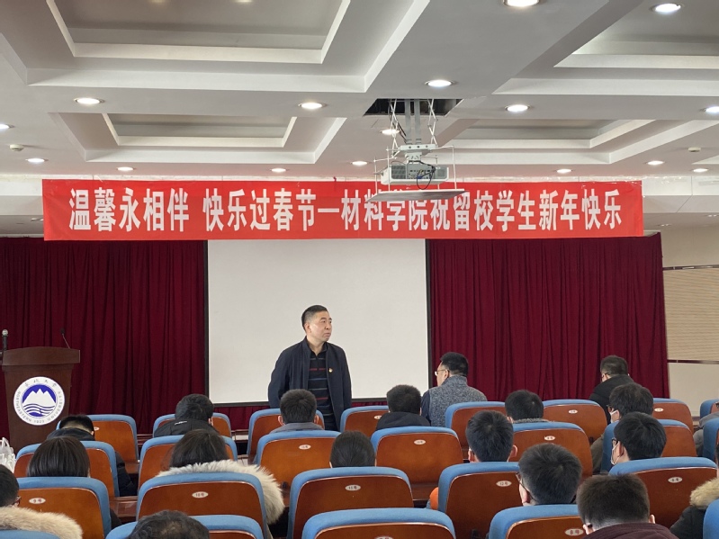 牛年新春在即,为使留校学生度过一个欢乐、祥和、充实、安全的春节假期,材料学院于2月8日上午在知行楼634室开展“2021年材料学院寒假留校学生新春慰问活动”。院长秦高梧、党委书记张玉宝、党委副书记兼副院长贺翔、学办主任孙巍巍及辅导员杨壹程、学生干事闫非与120多名留校学生欢聚一堂,了解大家在校的学习生活情况,并传达学校在疫情防控、实验安全、宿舍管理、校园服务等方面的信息。