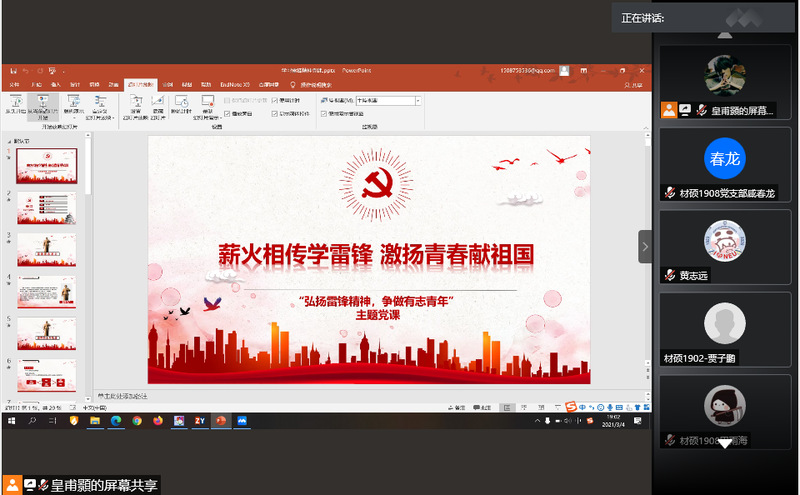 为弘扬新时代雷锋精神,激发党员学习雷锋的热情,3月4日晚,材料学院硕士1902、1906、1908和1909党支部联合开展以“弘扬雷锋精神,争做有志青年”主题的党课活动,各支部全体成员参加本次活动。