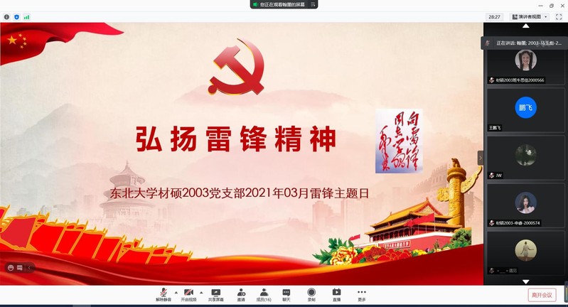 为弘扬雷锋精神,提高党支部成员思想政治高度,3月4日晚,材料学院硕士2003党支部开展以“学习时代楷模,弘扬雷锋精神”为主题的党日活动,支部全体党员和入党积极分子参加此次活动。