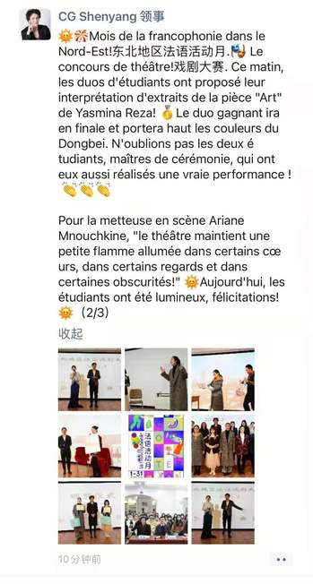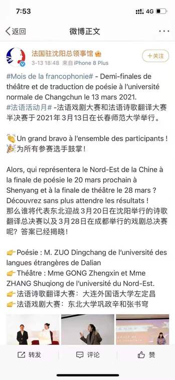 在东北赛区比赛中,两位同学精心准备服装道具,通过比赛环节的出色表现、评委现场提问环节的精彩回答,在现场赢得阵阵掌声,得到了在评委们的一致认可和赞许。法国驻沈阳总领事馆总领事安澜女士对她们的表演给予了高度评价:两人对该戏剧进行了完美的演绎,希望她们在总决赛上代表东北地区大放异彩(来自对安澜女士法语评价的翻译)。