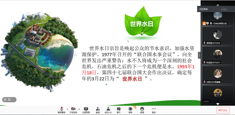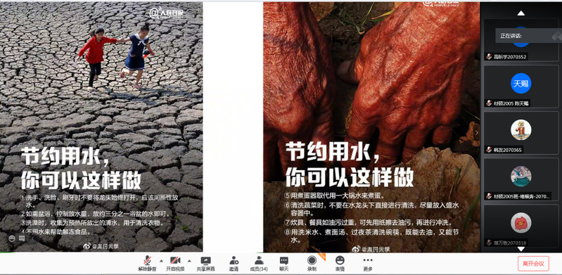为贯彻落实习近平总书记提出的“节水优先、空间均衡、系统治理、两手发力”新时代治水思路,喜迎第二十九届“世界水日”的到来,3月22日,材料学院硕士2005党支部线上开展了以“节约水资源,保护水环境”为主题的党日活动,支部全体党员和积极分子参加了此次活动。