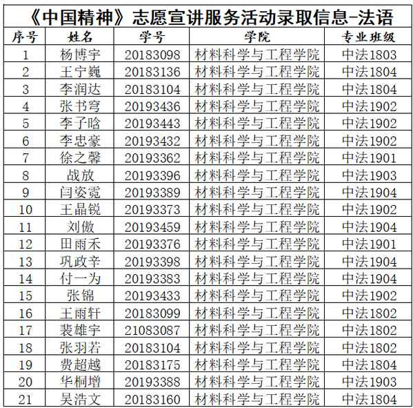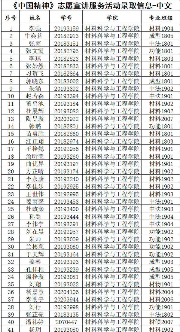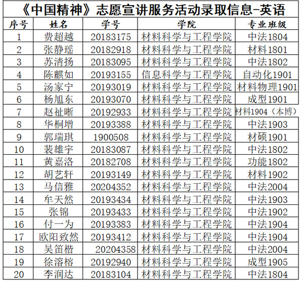 中国精神宣讲活动意在选拔优秀志愿者、讲述党史故事、传播红色基因、传承中国精神、弘扬志愿服务精神,报效伟大祖国。2021年3月21日,材料学院举办中国精神宣传志愿者选拔活动,分中、英、法三语,学院通过对志愿者思想品德、综合素质审查,以中国革命精神、雷锋精神、五四精神、脱贫攻坚精神等精神为题,通过面试和演讲等方式进行志愿者选拔。