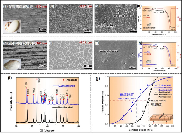 图1 鹦鹉螺贝壳(a-d)与褶纹冠蚌贝壳(e-h)的板片尺寸、板片表面形貌及TGA分析曲线;(g) 两种贝壳的XRD衍射分析结果;(h) 两种贝壳三点弯曲强度的Weibull统计结果