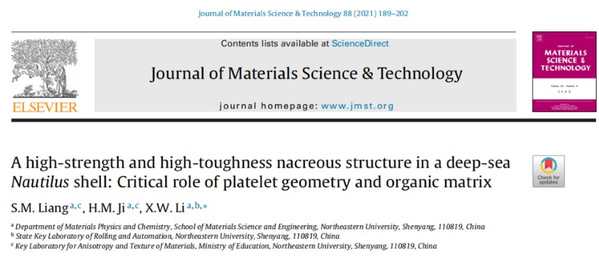 Liang, S.M., Ji, H.M., Li, X.W.* (2021): A High-strength and High-toughness Nacreous Structure in a Deep-sea Nautilus Shell: Critical Role of Platelet Geometry an Organic Matrix. Journal of Materials Science & Technology, 88, 189-202. (IF = 6.155, 中科院1区)