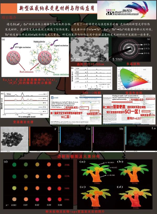 项目简介:基于纳米材料的诸多优良特性及稀土元素的荧光性质,我们以LaF3:Eu3+纳米颗粒为研究对象,在其表面嫁接稀土配合物Tb(hfa)3(H2O)3,制备温感纳米荧光材料,实现绿光→红光的温感荧光发射;这种新型温感纳米荧光材料在不同温度下呈现动态发光,难以复制,具有很高的防伪安全性,可实现多重防伪功能,是光学防伪的优良材料。