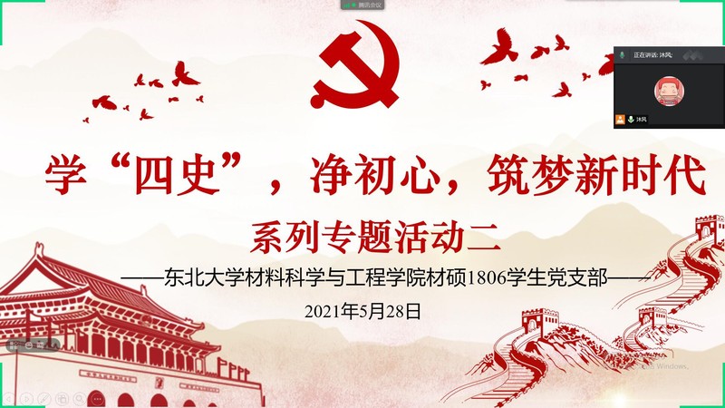 为庆祝建党100周年,引导党员从党史中汲取精神力量和经验智慧,5月28日晚,材料学院硕士1806党支部开展了以“学四史,净初心,筑梦新时代”为主题的线上党日系列活动二,支部全体党员参加本次活动。