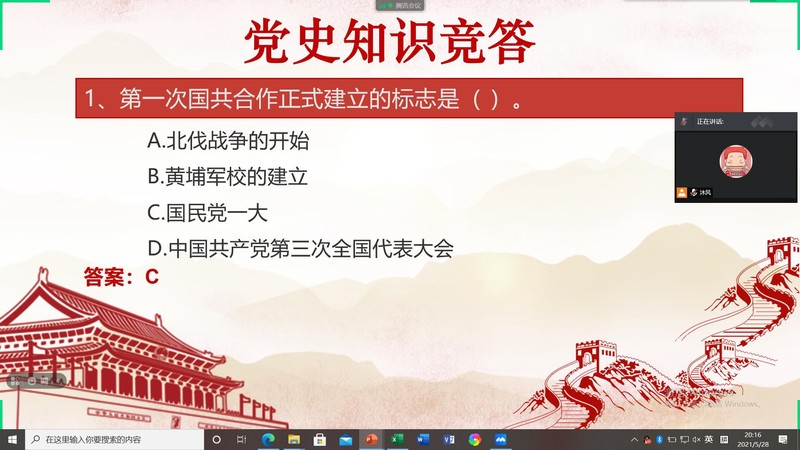 基于前期党史与新中国史的学习,本次活动由刘思彤和李敬作为主讲人,分别就“改革开放史”和“社会主义发展史”展开了详细讲解。在学习中大家理解了改革开放是中国走向繁荣富强的必由之路,是中国特色社会主义发展前进的必由之路,同时大家也体会到了中国乃至世界的社会主义发展较为曲折,中国特色社会主义发展至今实属来之不易。而后展开“四史”知识竞答环节,在竞答中大家再次巩固了重大的历史节点和会议精神。最后党员们积极踊跃地交流了自己的所学所感,大家纷纷表示要从“四史”的学习中汲取力量,科学把握党和国家所处的历史方位,树立正确的历史观、国家观、民族观、文化观,为中华民族的伟大复兴贡献自己的一份力量。