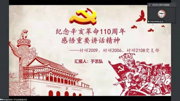 为纪念辛亥革命110周年,进一步加深同学们对辛亥革命历史的了解,10月10日晚,材料学院硕士2108党支部联合硕士2006党支部、硕士2009党支部采用腾讯会议形式,开展以“纪念辛亥革命110周年,感悟重要讲话精神”为主题的党日活动,各支部全体成员参加此次活动。