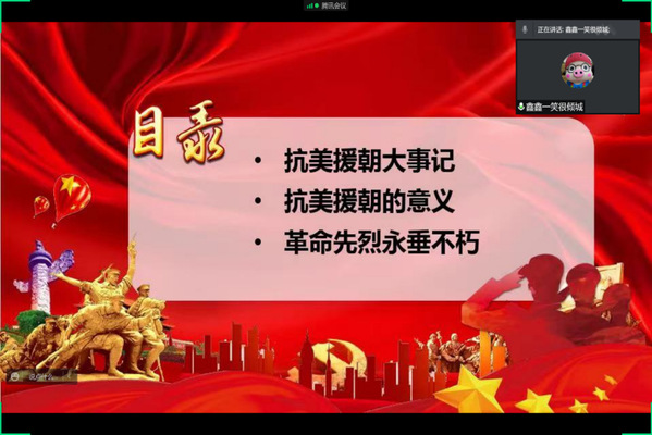 为了纪念抗美援朝战争,弘扬爱国主义精神,激发支部同学继承遗志砥砺前行的斗志,10月21日,材料学院硕士2008党支部开展以“重温抗美援朝,纪念伟大精神”为主题的线上党日活动,支部全体成员参加此次活动。