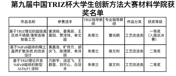 11月8日,中国银行·TRIZ杯第九届中国大学生创新方法大赛决赛评审结果揭晓。材料科学与工程学院共获一等奖1项,二等奖2项。由材料学院曹光明老师指导,学生姜淇铭、姜禹辰、王晨阳、贾泽伟、单文超完成的作品《基于TRIZ理论的超级奥氏体不锈钢薄带连铸制备工艺》荣获工艺改进类作品一等奖、全国12强并入围总决赛(雷竞技官方主页共3项)。