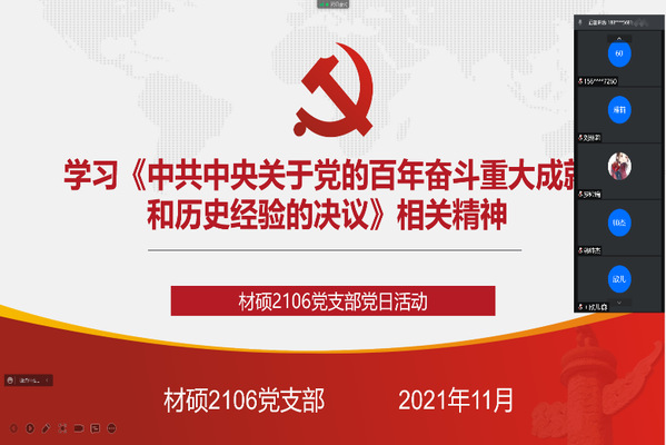 为持续推动党史学习教育,进一步提高同学们对党的百年奋斗史的认识,11月28日晚,材料学院硕士2106党支部在线上开展了以“学党史,悟思想,知党恩,守初心”为主题的党日活动,支部全体成员参加了此次活动。