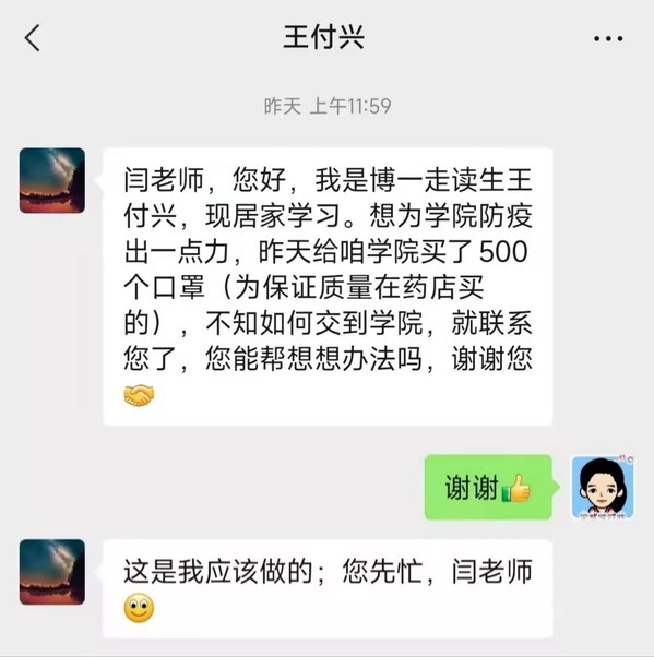 材料学院博士一年级走读生王付兴因疫情原因居家学习,在校外心系校园疫情防控,自费购买防疫物资500只口罩和10瓶酒精消毒液捐赠给学院,希望为学院疫情防控与物资储备贡献力量,学院向王同学表达了诚挚的感谢。