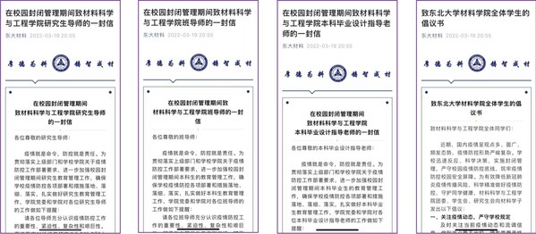 校园封闭管理期间,材料学院党委下发了《在校园封闭管理期间致材料科学与工程学院研究生导师的一封信》《在校园封闭管理期间致材料科学与工程学院班导师的一封信》《在校园封闭管理期间致材料科学与工程学院毕业设计导师的一封信》,发挥研究生导师、班导师、毕业设计导师作用,全院形成合力做好学生疫情防控、学习科研和学生教育管理服务工作,严守校园疫情防控底线,筑牢疫情防控校园安全屏障