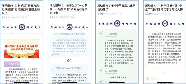 学院团委、学生会、研究生会向全体学生发布倡议书,引导广大材料学子严守学校规定、提升科学防护意识、加强学风建设、养成健康卫生的生活习惯。举办了“青春向党 运动强国”运动挑战周、“一心移疫,一起向未来”系列打卡、寝室文化节、学习笔记大赛等文化和体育活动,引导同学们强化责任意识和大局意识,全力配合学校、学院疫情防控各项工作,养成良好的学习生活习惯,相互监督、互相帮助,互相关心、团结共进,以乐观心态与高效状态保质保量完成线上学习和科研任务,打造温暖有爱的防控战线。