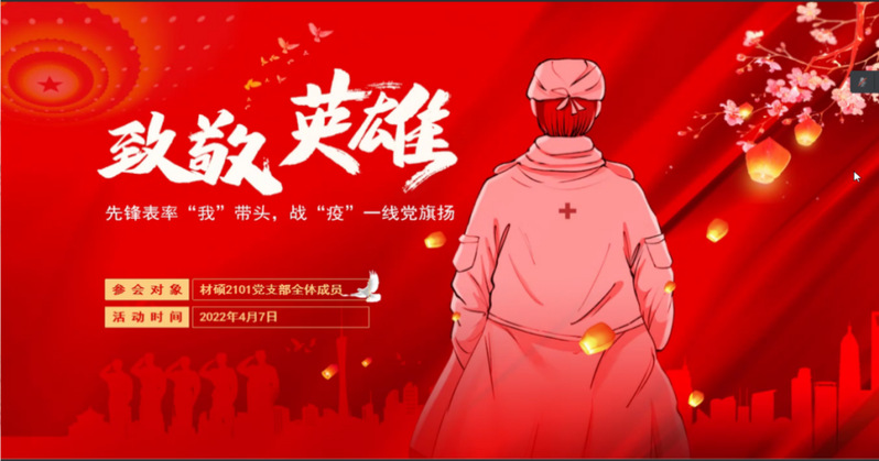 为进一步发挥党员的先锋模范作用,筑牢校园疫情防控“红色堡垒”,4月7日,材料学院硕士2101党支部开展以“先锋表率‘我’带头,战‘疫’一线党旗扬”为主题的线上党日活动,支部全体党员参与此次活动。