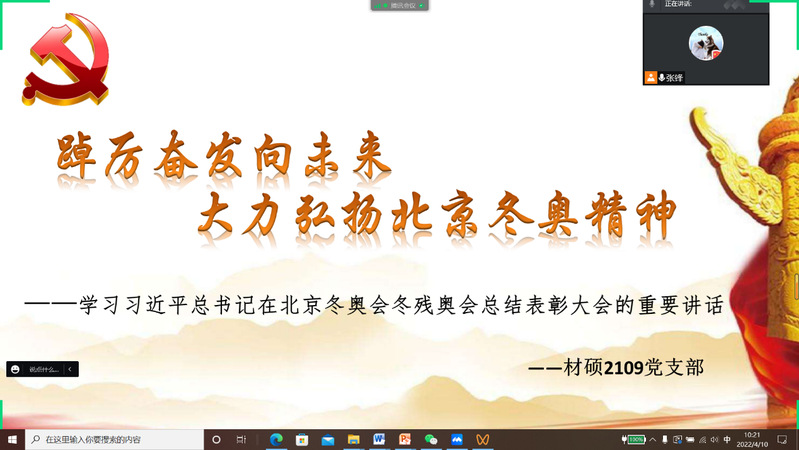 为学习贯彻习近平总书记在北京冬奥会冬残奥会总结表彰大会上重要讲话,提高支部成员的党性修养,4月10日,材料学院硕士2109党支部开展了以“踔厉奋发向未来,大力弘扬北京冬奥会精神”为主题的党日活动,支部全体成员参与此次活动。