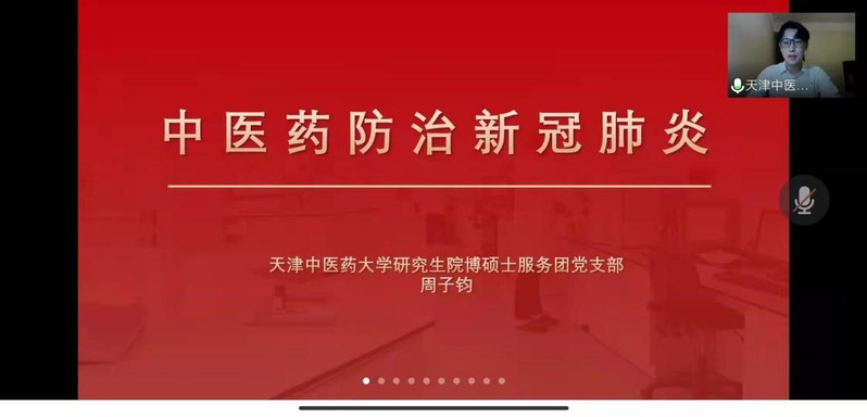 此次活动由硕士2004党支部书记于昊玮主持。活动伊始,于昊玮详细讲解了此次活动的主题和内容,和同学们一起学习了习近平对中医药工作作出的重要指示,介绍了天津中医药大学研究生院博硕士服务团党支部的优秀事迹。随后,天津中医药大学研究生院博硕士服务团党支部周子钧以“中医药防治新冠肺炎”为主题,从中医的角度解读了什么是新冠肺炎以及轻重型新冠患者的中医药治疗方案,介绍了中医药预防新冠肺炎的方法,并倡导大家要保持心情舒畅,端正态度面对疫情防控,积极配合学校疫情防控工作,合理运用中医知识提升自身免疫力。讲解结束后,同学们结合自身生活,就生活中存在的有关中医药、疫情防控、心理健康等方面问题同周子钧进行了交流。活动最后,于昊玮号召同学们在关注身体健康的同时,重视心理健康,在遵守疫情防控规定的前提下,主动参加学校举办的各项文体活动以缓解校园封闭期间的心理压力,做好个人防护,共筑防疫城墙。
