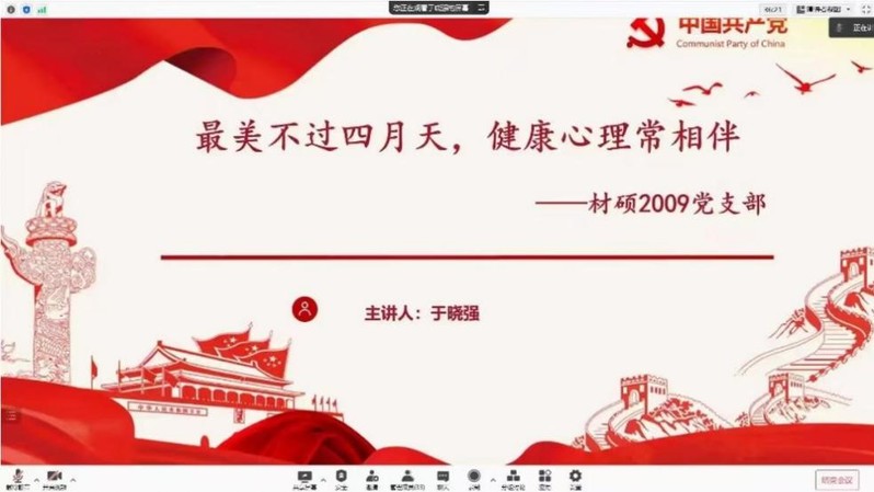 为缓解封校期间支部成员的心理压力,增强支部成员调节情绪的能力,4月23日,材料学院硕士2009党支部于线上开展以“最美不过四月天,健康心理常相伴”为主题的党日活动,支部全体成员参与此次活动。
