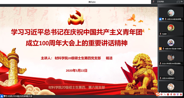 为深入学习贯彻习近平总书记在庆祝中国共产主义青年团成立100周年大会上的重要讲话精神,5月22日晚,材料学院硕士2004、2006党支部联合于线上开展以“学习重要讲话,争做时代青年”为主题的党课,支部全体成员参加本次党课。