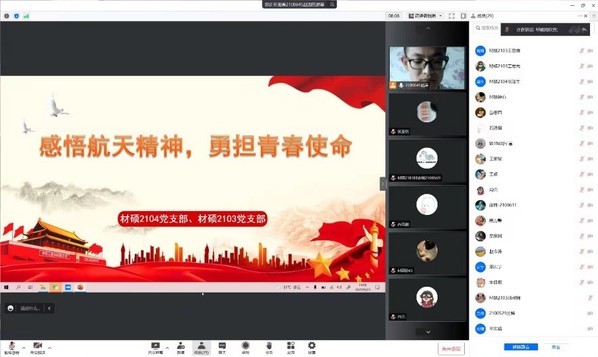 为弘扬载人航天精神,激发同学们学习航天英雄勇于攀登、敢于超越的进取意识,6月23日晚,材料学院硕士2103、2104党支部联合开展了以“感悟航天精神,勇担青春使命”为主题的线上党日活动,支部全体成员参与此次活动。