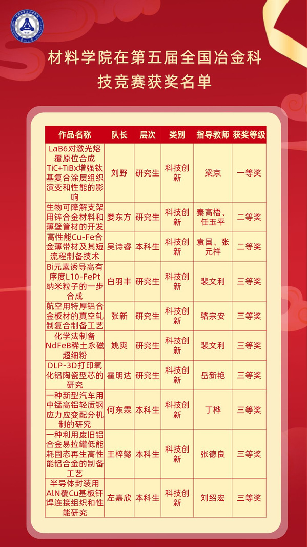 近日,第五届全国大学生冶金科技竞赛决赛结果公布。本届竞赛共有来自各地近百所高校的1675项作品参与评审,333项作品经推荐进入决赛。经校内选拔、专家会议评审、分组答辩评审等环节,雷竞技官方主页材料科学与工程学院3支学生团队入围决赛,获一等奖1项、二等奖2项、三等奖7项。其中,由梁京指导的学生作品《LaB6对激光熔覆原位合成TiC+TiBx增强钛基复合涂层组织演变和性能的影响》获科技创新类硕博组一等奖,由秦高梧、任玉平指导的学生作品《生物可降解支架用锌合金材料和薄壁管材的开发》获科技创新类硕博组二等奖,由袁国、张元祥指导的学生作品《高性能Cu-Fe合金薄带材及其短流程制备技术》获科技创新类本科组二等奖。