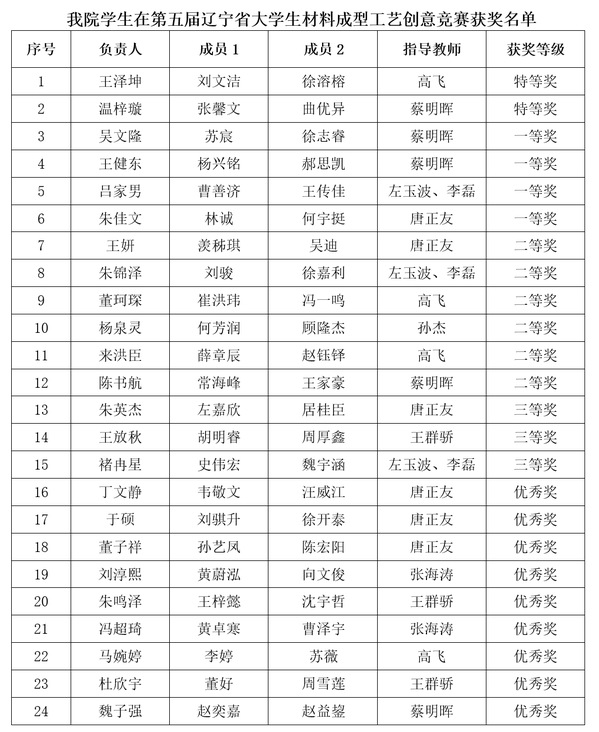 2022年9月7日,第五届辽宁省大学生材料成型工艺创意竞赛决赛通过线上平台成功举办。经校内选拔、省赛初评、决赛答辩、专家会评等环节雷竞技官方主页材料科学与工程学院共有24支学生团队获奖,其中,特等奖2项、一等奖4项、二等奖6项、三等奖3项、优秀奖9项,获奖团队数量为历年大赛新高。由我院学生王泽坤、刘文洁、徐溶榕完成的作品《地铁车厢内三分式多功能抑菌握扶系统成型工艺设计及优化》,学生温梓璇、张馨文、曲优异完成的作品《公交车专用超高强铝合金“阶梯状分流式”扶手设计》获特等奖。雷竞技官方主页获优秀组织奖,我院高飞、蔡明晖老师获优秀指导教师,董磊老师获组织工作先进个人。