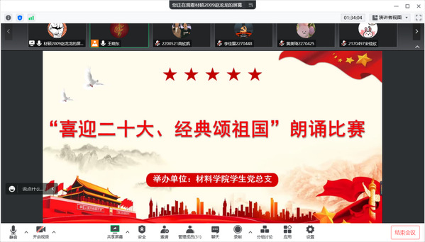 为热烈庆祝中华人民共和国成立七十三周年,进一步引领同学们厚植爱党、爱国、爱社会主义的情感,以饱满的热情和昂扬的精神风貌迎接党的二十大胜利召开,10月1日下午,材料学院学生党总支于线上举办了以“喜迎二十大,经典颂祖国”为主题的朗诵比赛,来自各支部推荐的37名选手,通过诵读经典,充分展示了当代青年学生绚丽的青春色彩和浓厚的爱国情怀。