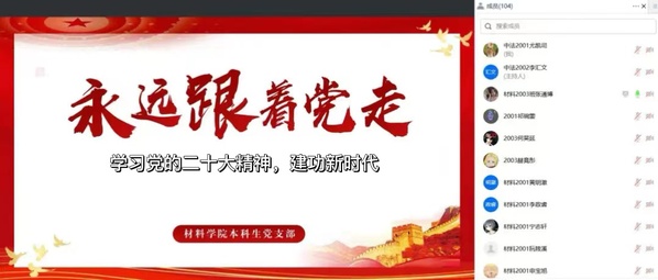 为深入学习贯彻党的二十大精神,引领支部成员坚定听党话、跟党走的决心,11月25日晚,材料学院本科生党支部于线上开展以“学习党的二十大精神,建功新时代”为主题的党日活动,支部全体成员参与本次活动。