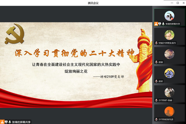 为深入学习贯彻党的二十大精神,进一步激发同学们的奋斗热情,11月27日晚上,材料学院硕士2109党支部于线上开展以“深入学习贯彻党的二十大精神”为主题的党日活动,支部全体成员参加此次活动。