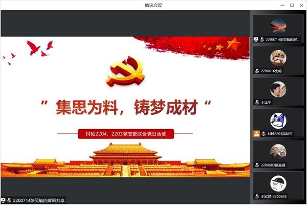 为帮助同学们了解专业前景,明确前进方向,更好地响应习近平总书记在党的二十大报告中提出的对广大青年的号召,11月26日上午,材硕2203、2204党支部于线上联合开展了以“集思为料,铸梦成材”为主题的党日活动,两个支部全体成员参加此次活动。