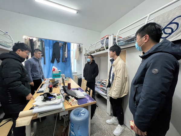 在走访慰问过程中,检查了宿舍的用电安全等多方面情况;对同学们的疑问进行详细解答;表达了学校、学院对同学们的关心关爱。希望同学们坚定信心、共度难关,共同筑牢校园疫情防控屏障。